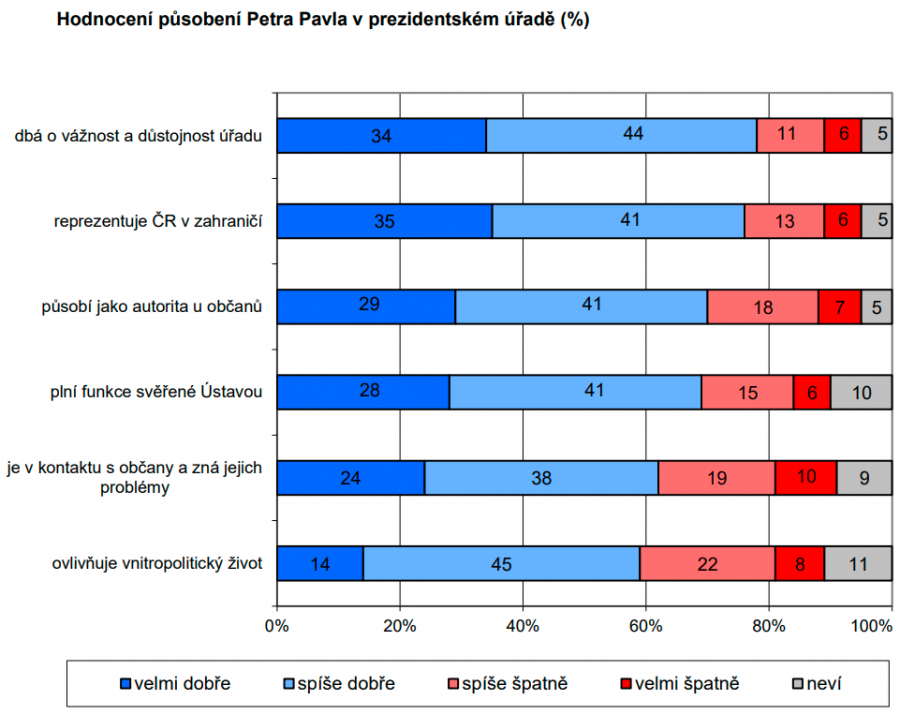 Působení Petra Pavla na postu prezidenta vnímají lidé v Česku převážně pozitivně. Nejpříznivěji veřejnost hodnotila, jak dbá o vážnost a důstojnost úřadu (78 %) a jak reprezentuje ČR v zahraničí (76 %). Vyplynulo to z průzkumu Centra pro výzkum veřejného mínění Akademie věd ČR (CVVM).