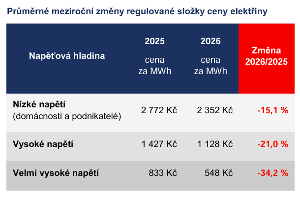 Energetický regulační úřad (ERÚ) vydal změnový cenový výměr, kterým snižuje regulované ceny elektřiny pro příští rok. Změnový cenový výměr vychází v návaznosti na usnesení vlády, kterým přechází financování provozní podpory podporovaných zdrojů energie (POZE) na stát.