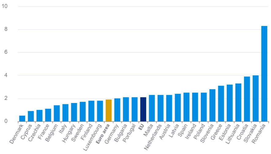 Nejvyšší tempo meziročního růstu cen zaznamenalo Rumunsko (8,3 procenta), Slovensko (4 %) a Chorvatsko (3,9 %).