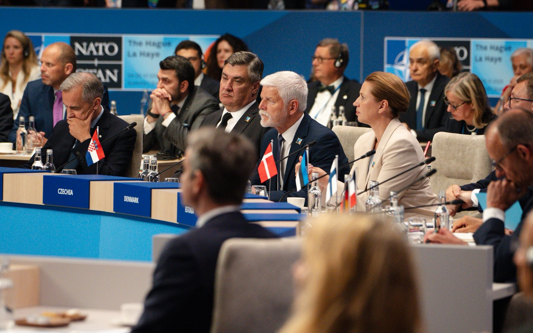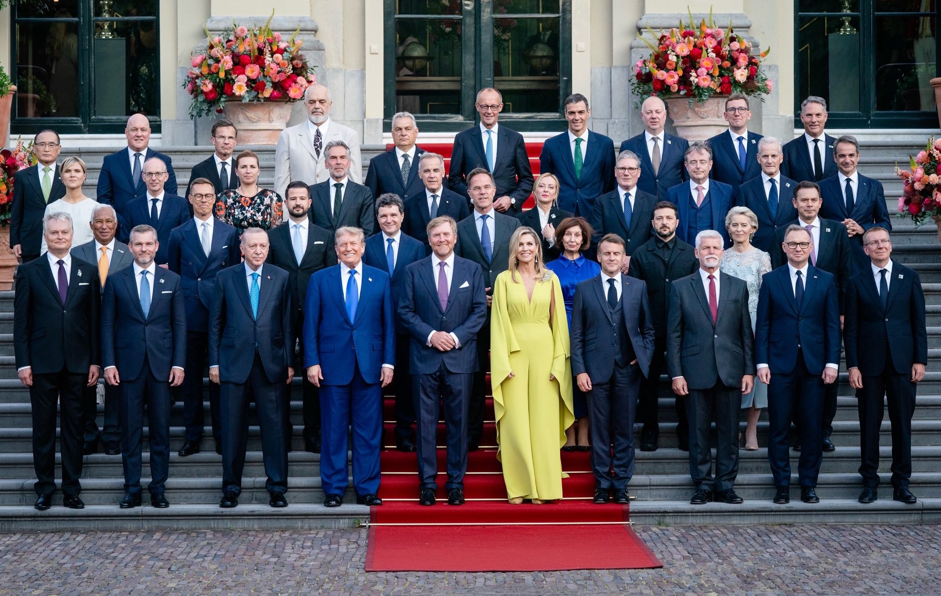 Summit NATO v roce 2025 za účasti prezidenta Petra Pavla. Akce se mj. účastnili i slovenský prezident Pellegrini (spodní řada, druhý zleva) či prezident Polska Andrzej Duda (spodní řada, druhý zprava)…