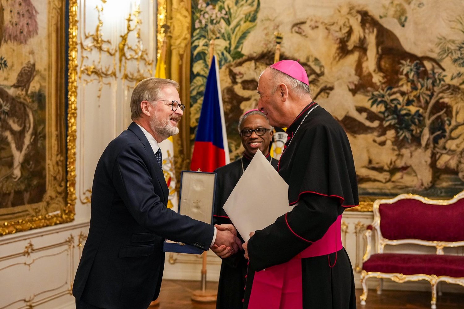 Předseda vlády v demisi Petr Fiala převzal z rukou apoštolského nuncia v ČR, arcibiskupa Jude Thaddeuse Okola vysoké papežské vyznamenání – Velký kříž Řádu Pia IX, které mu udělil papež Lev XIV. Jedná se o nejvyšší ocenění, jímž Svatý stolec vyznamenává představitele veřejného života, uvedl Úřad vlády.